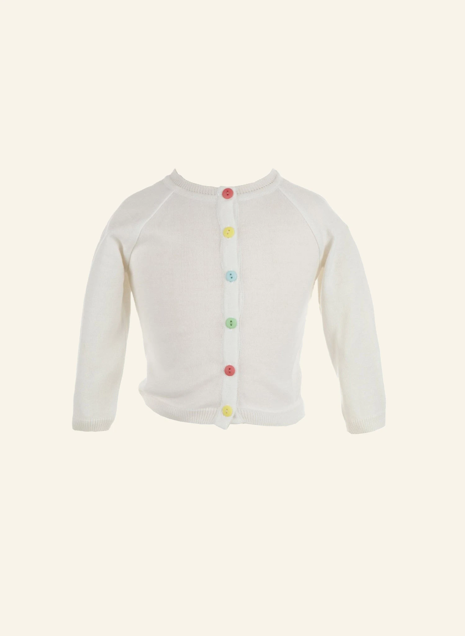 Our classic cardigan in ivory – with full length sleeves, a fitted waist and colourful contrasting buttons.