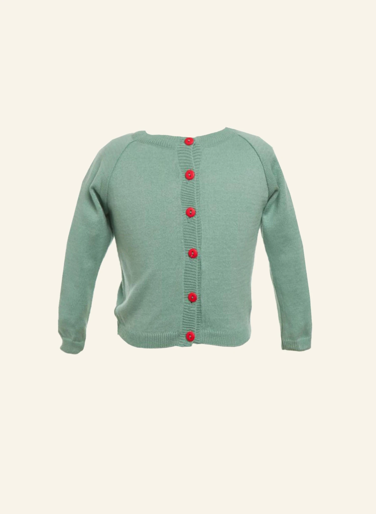 Our classic cardigan in sage – with full length sleeves, a fitted waist and colourful contrasting buttons.