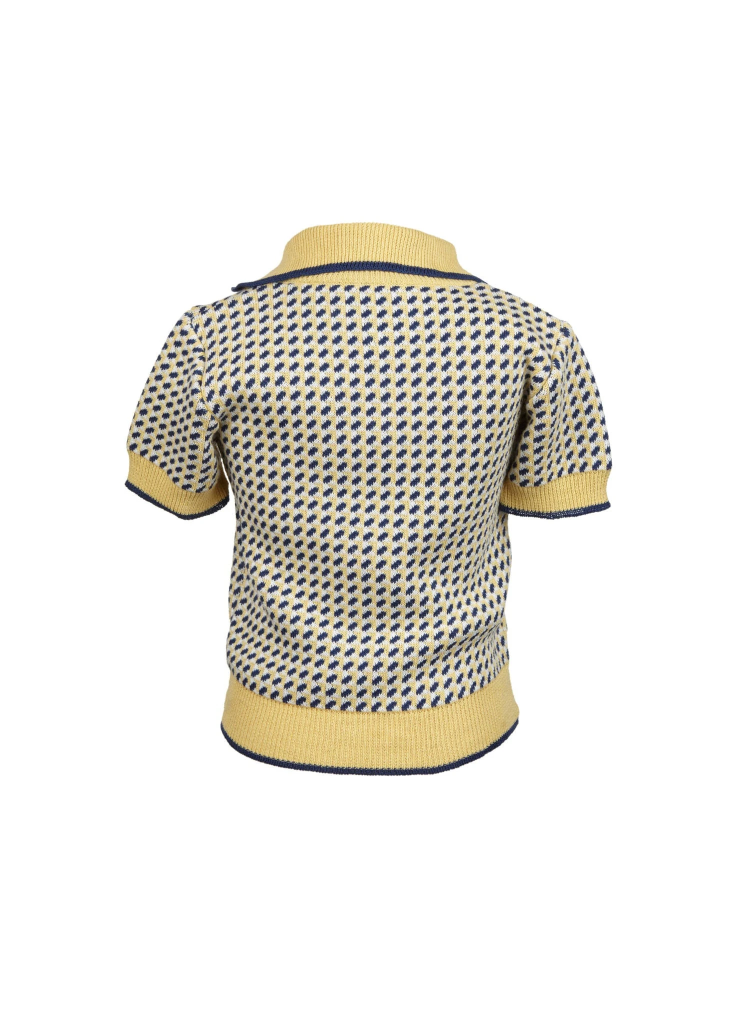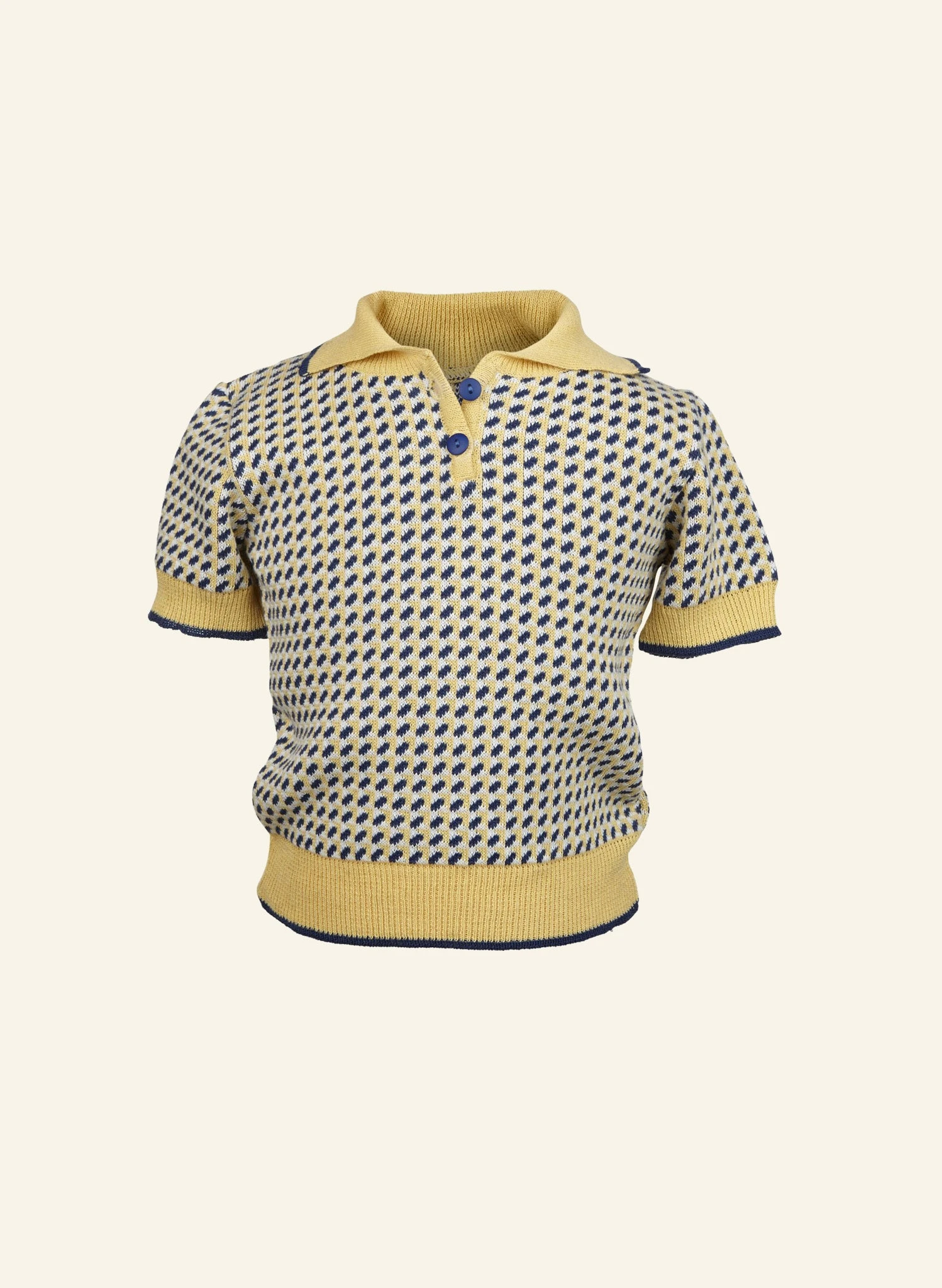 Featuring a lovely classic collar, two-button fastening and contrasting yellow trim, our knitted top is perfect worn with one of our Jenny skirts.Â
