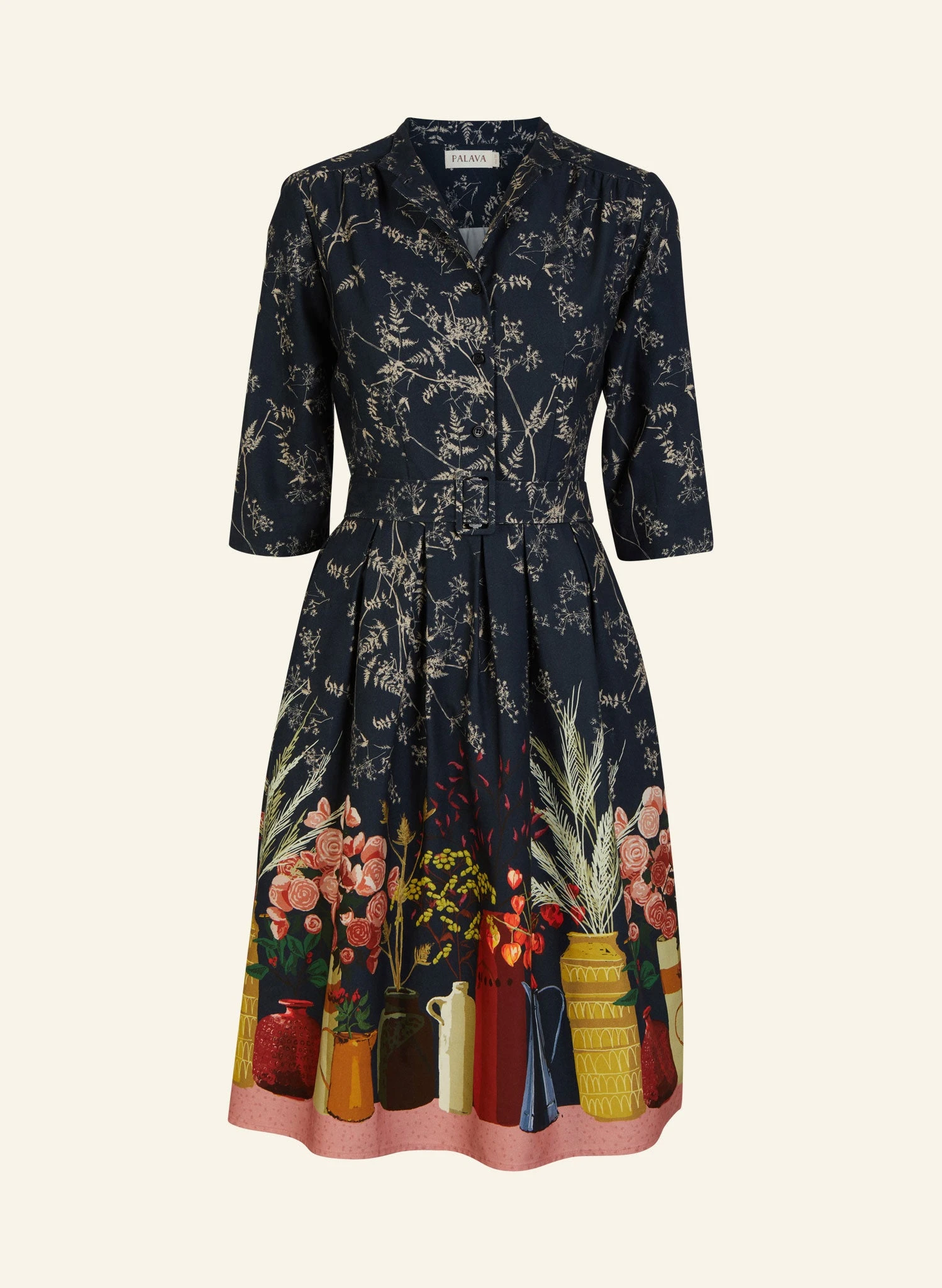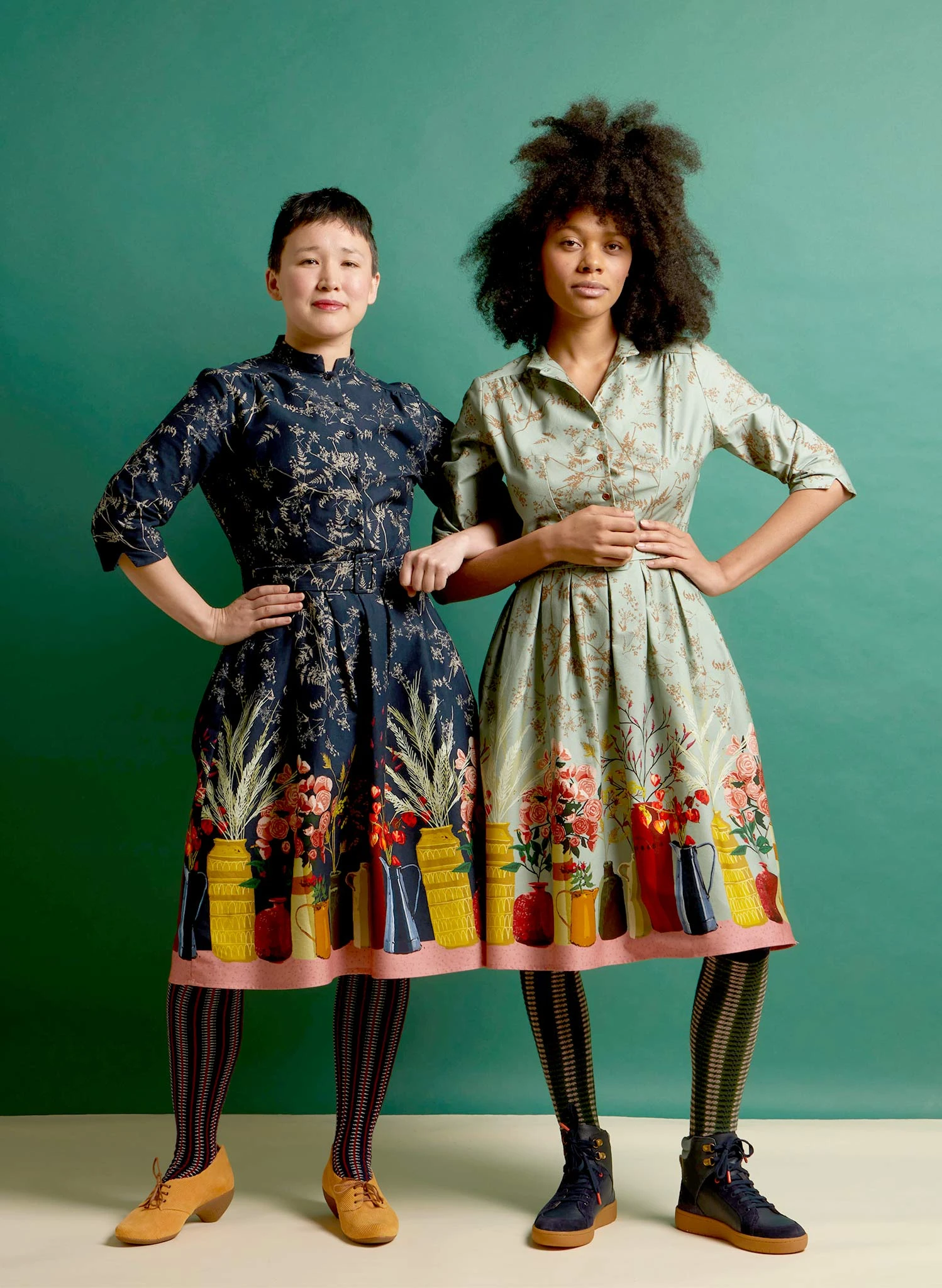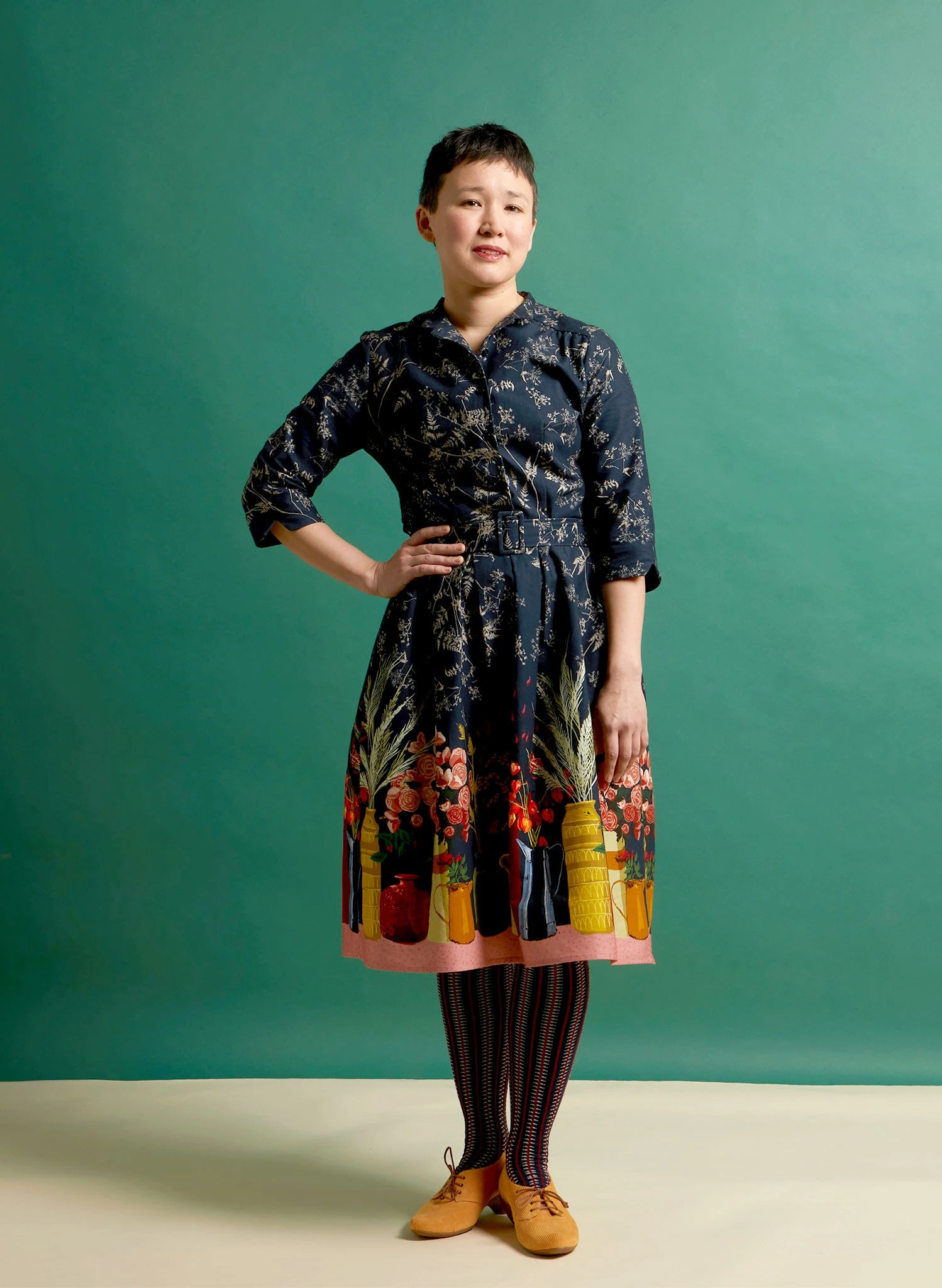 About the style: Cynthia is the shirt dress of our dreams; featuring a pretty mandarin collar that can be worn up or turned down, three-quarter length sleeves, a belted waist, deep pockets, and a full skirt. Our Cynthia dress creates a classic silhouette that looks flattering on a variety of figures thanks to its nipped-in waist.