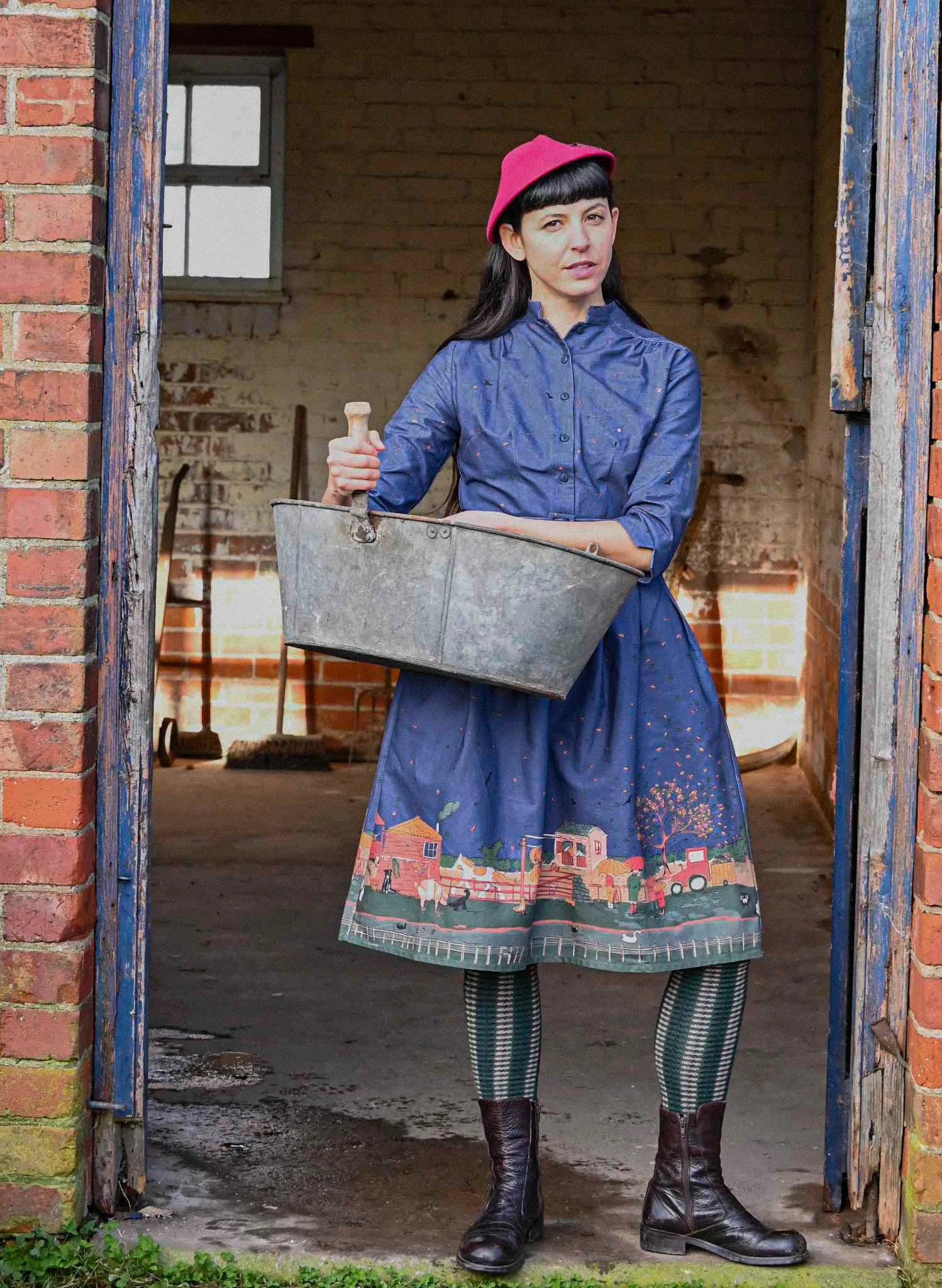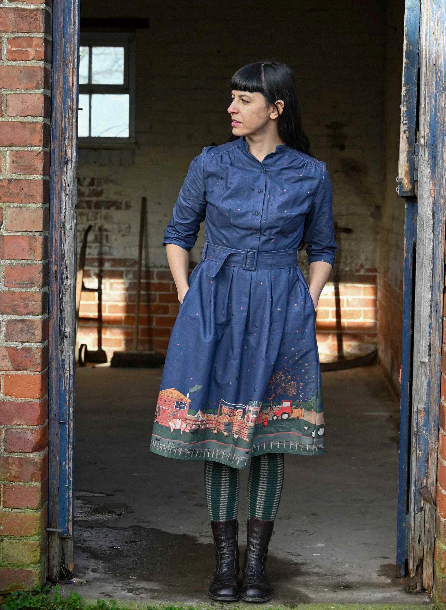 Her mandarin collar can be worn up for a structured look or turned down like a classic shirt collar, making her adaptable to different styles and body shapes. With deep pockets and a buckled waist, she creates an accessible vintage silhouette that flatters every figure. Cynthia is a true Palava staple—practical and flattering.