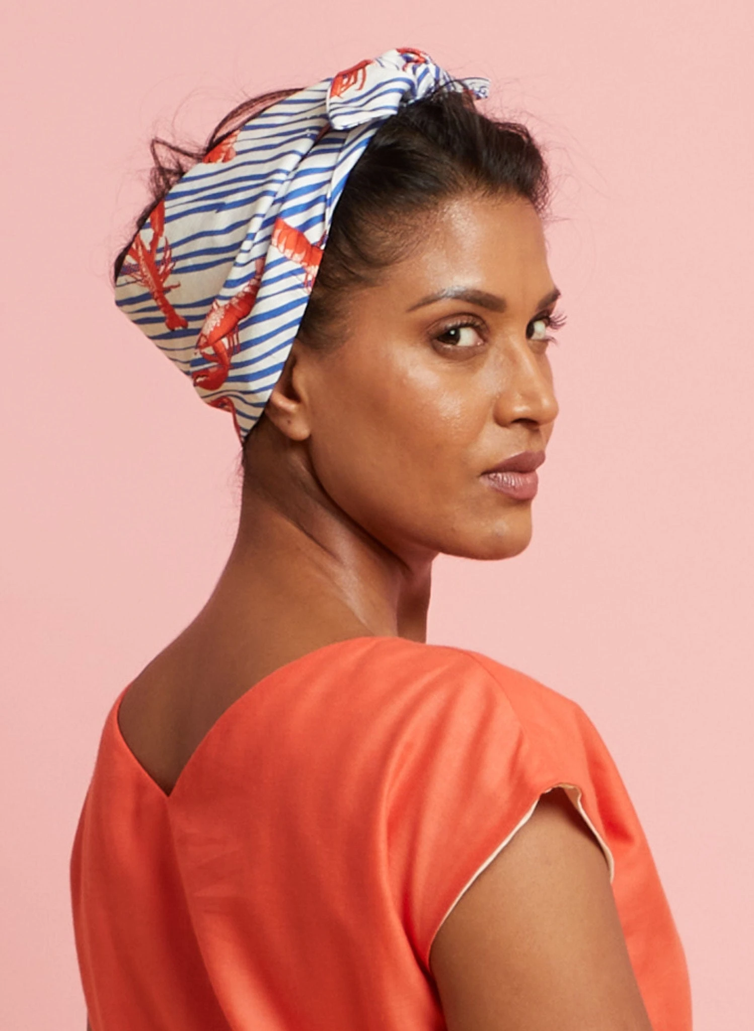 We don’t have a picture of someone wearing this, so for reference, we have included a picture of Marianne wearing the Lobster Print Hair Tie.