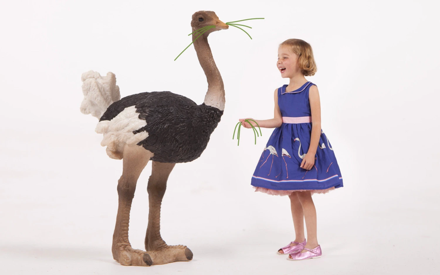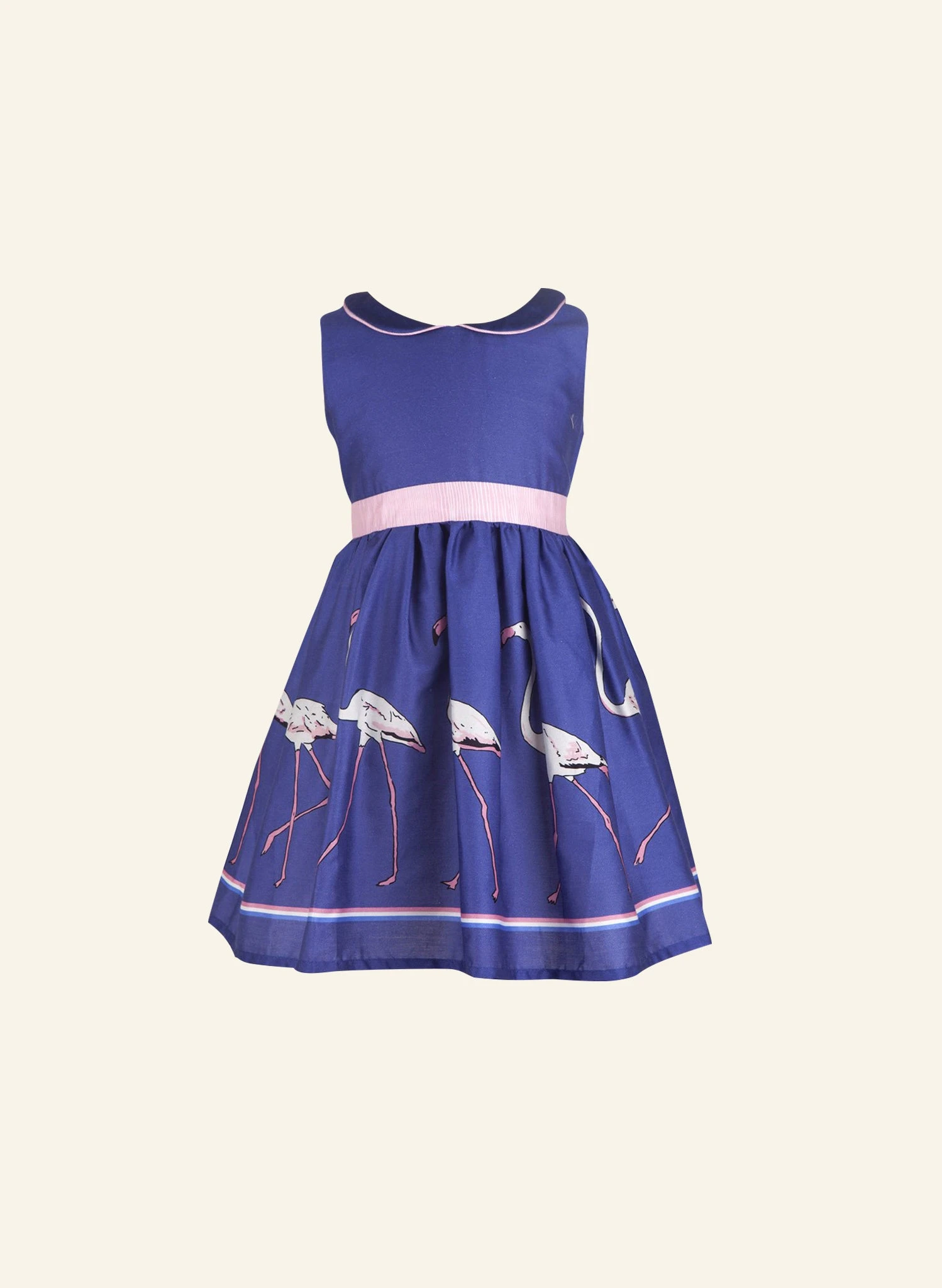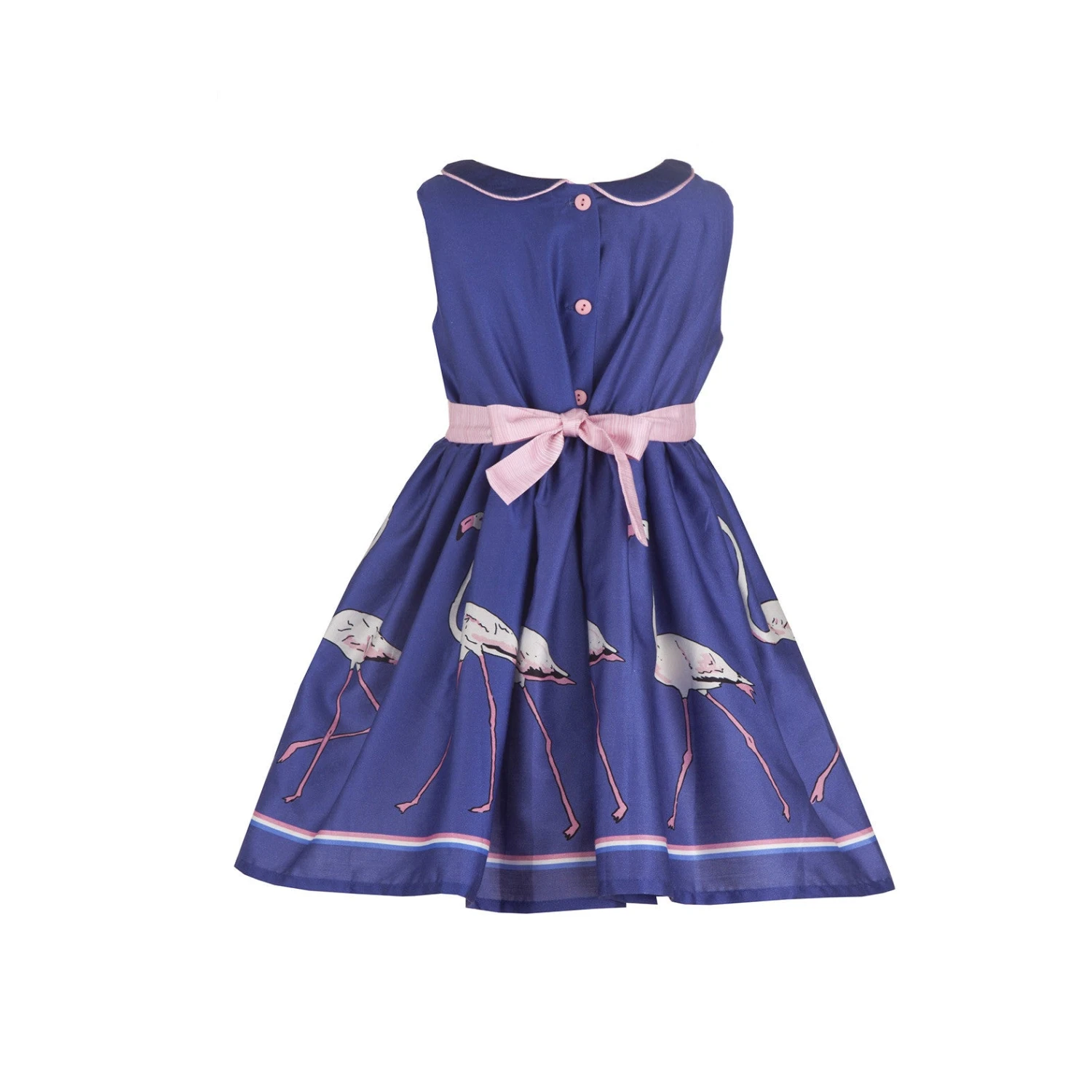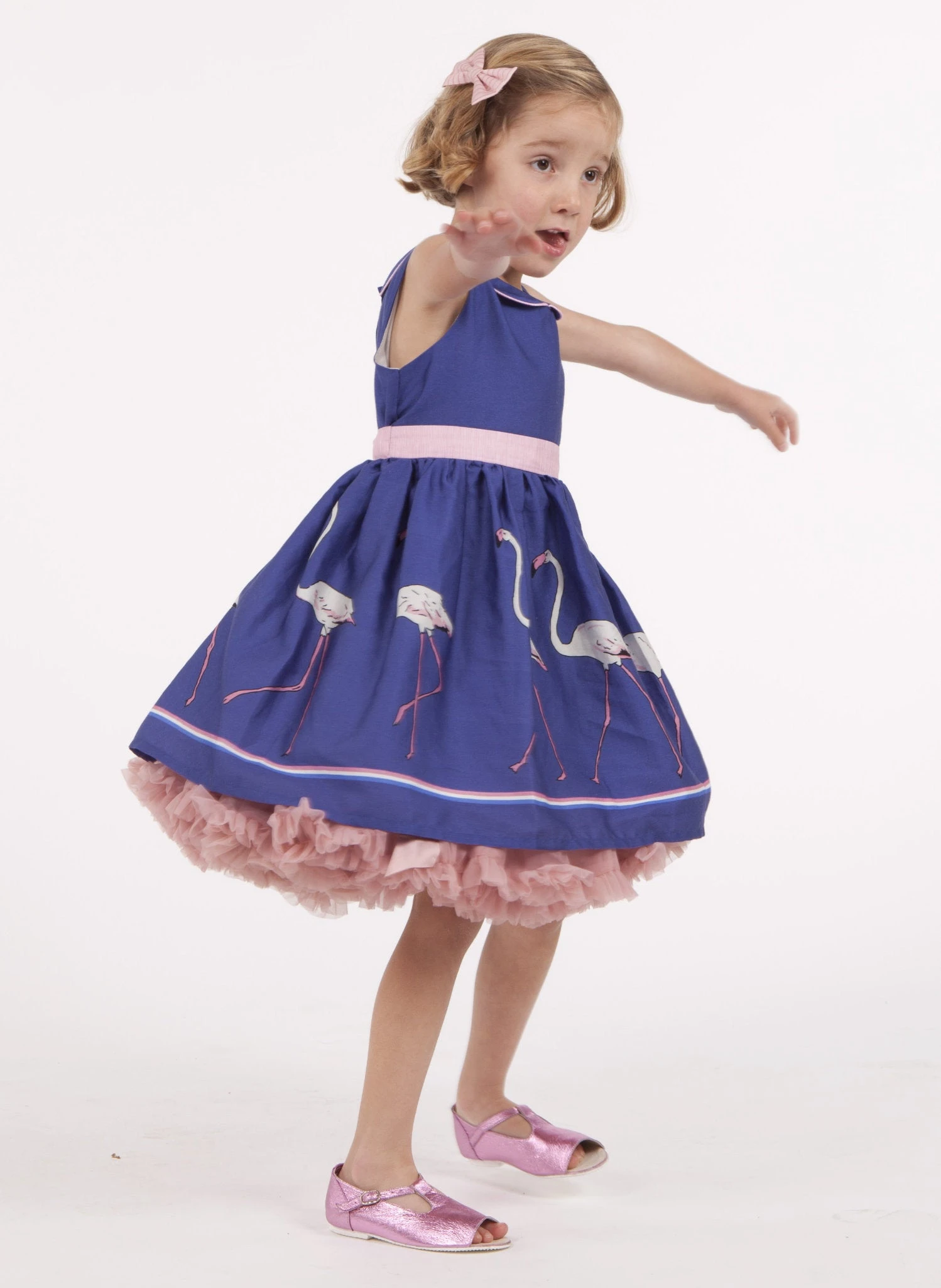 A parade of flamingos walk around the bottom of this Millie dress. Millie has plenty of room at the waist and a little sash at the back that allows the dress to be tied comfortably.