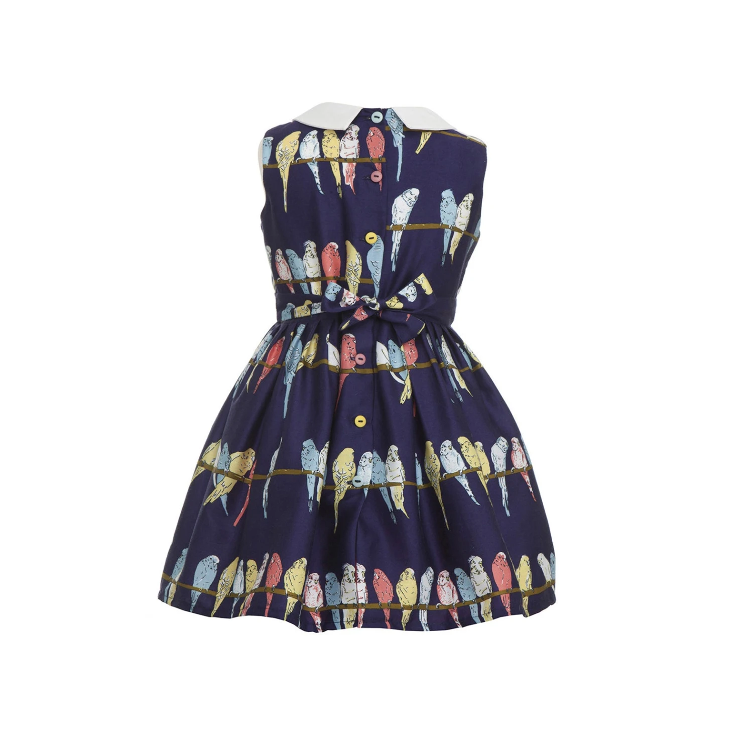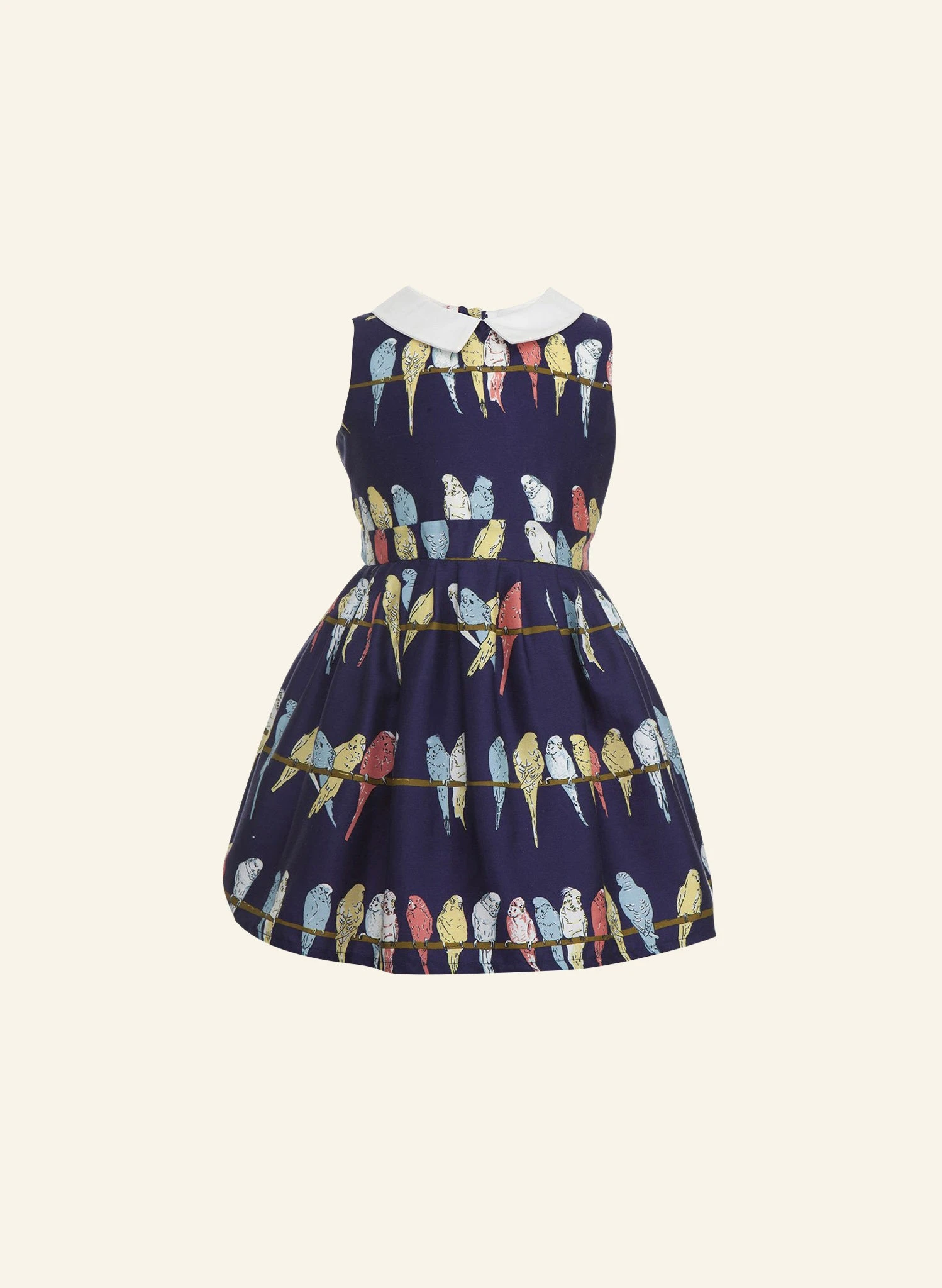 How many budgies can you count? Our Penny budgies dress features a sleeveless design, buttons at the back, cute white collar and tie waist.