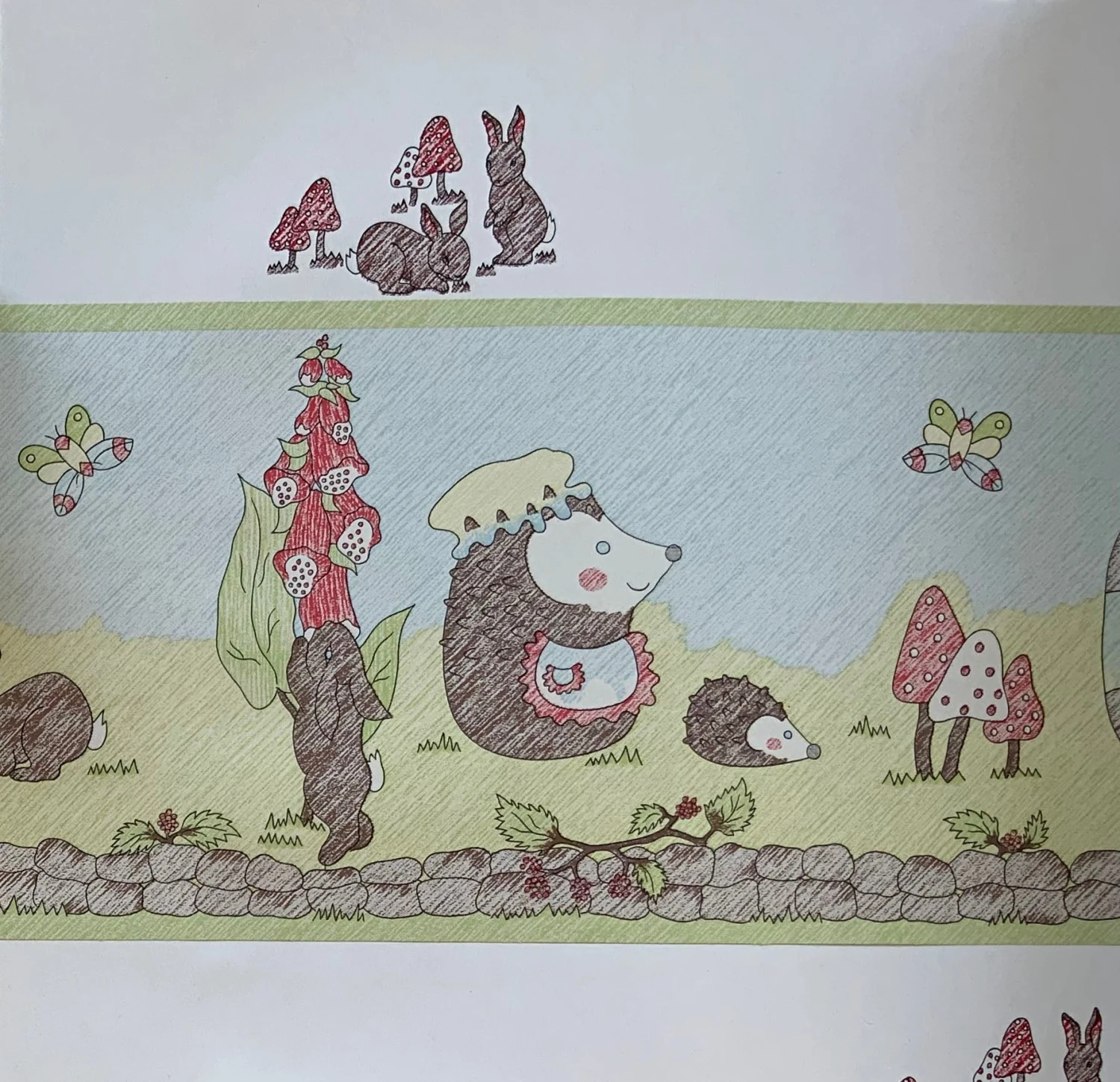 These Poppy borders are from the original product range of colourful interiors when Palava was Poppy. The borders are a great way to split a room and add a bit of interest. Each roll is 10 metres long, and this Large Mole and Hedgehog border is 18cm wide.Â