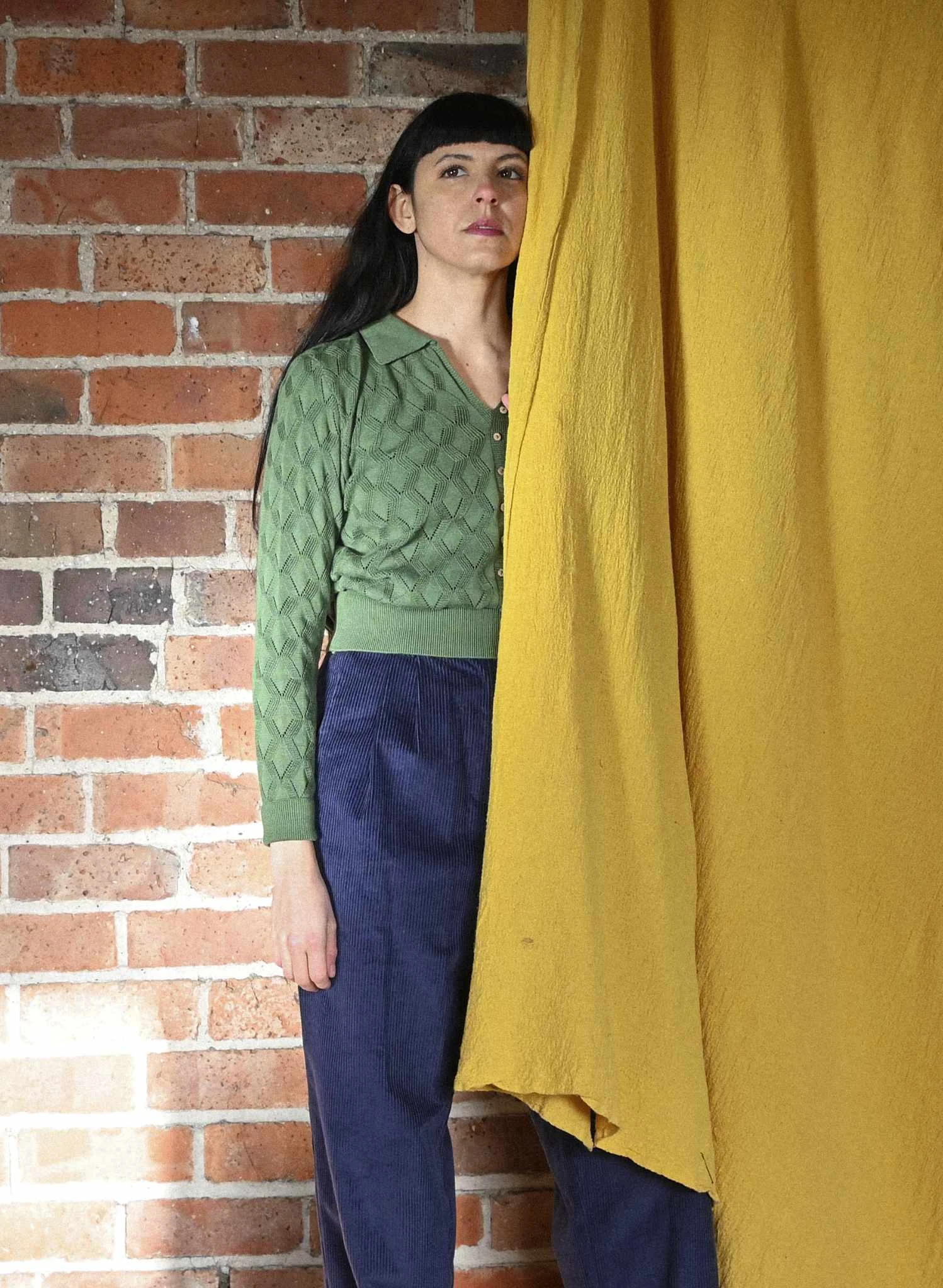 About the Style: Introducing our brand new knitted top: Rosie. Inspired by vintage knits, she’s got a beautiful detail in the weave creating an interesting pattern while remaining monochrome. She has a faux front to ensure there’s no gaping and lovely little coconut button detail.